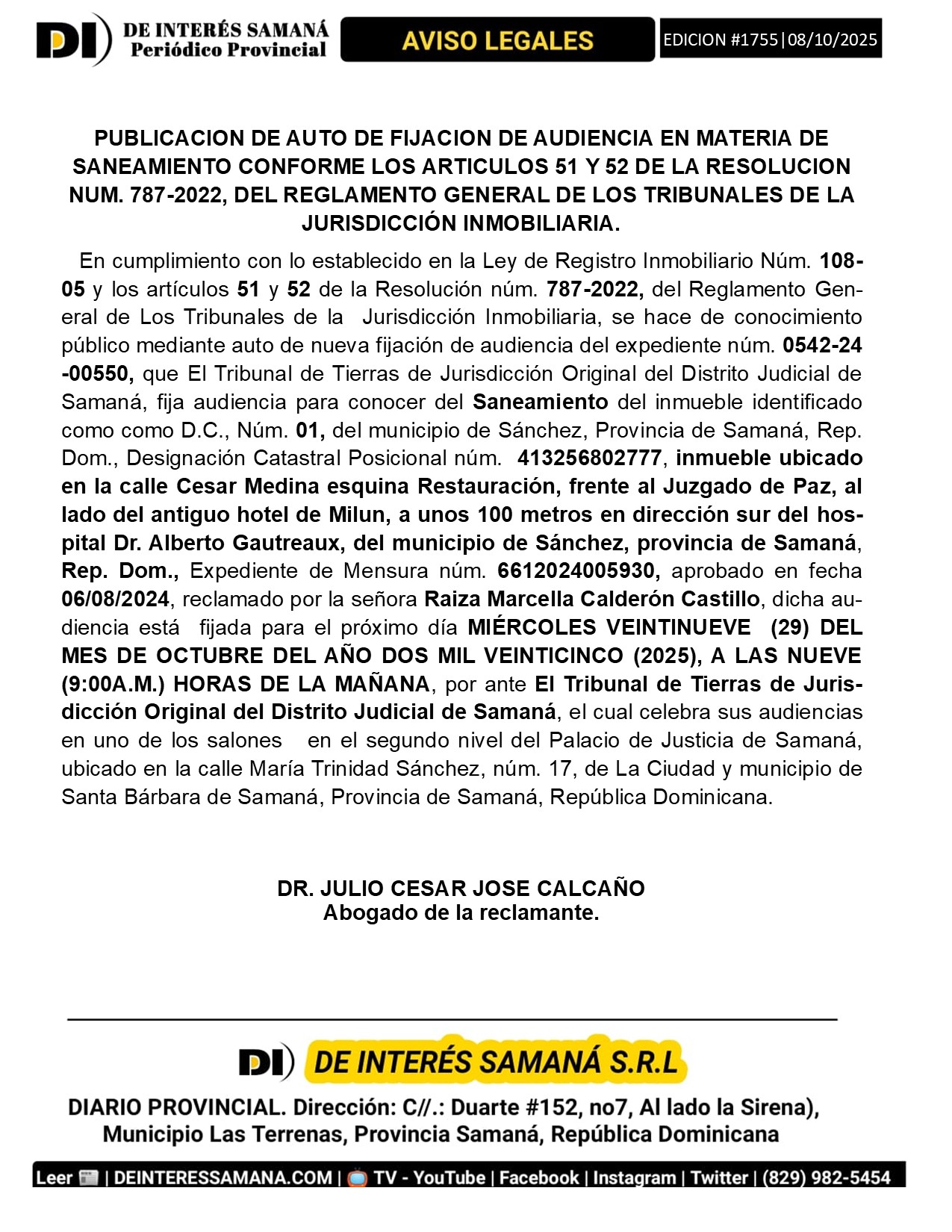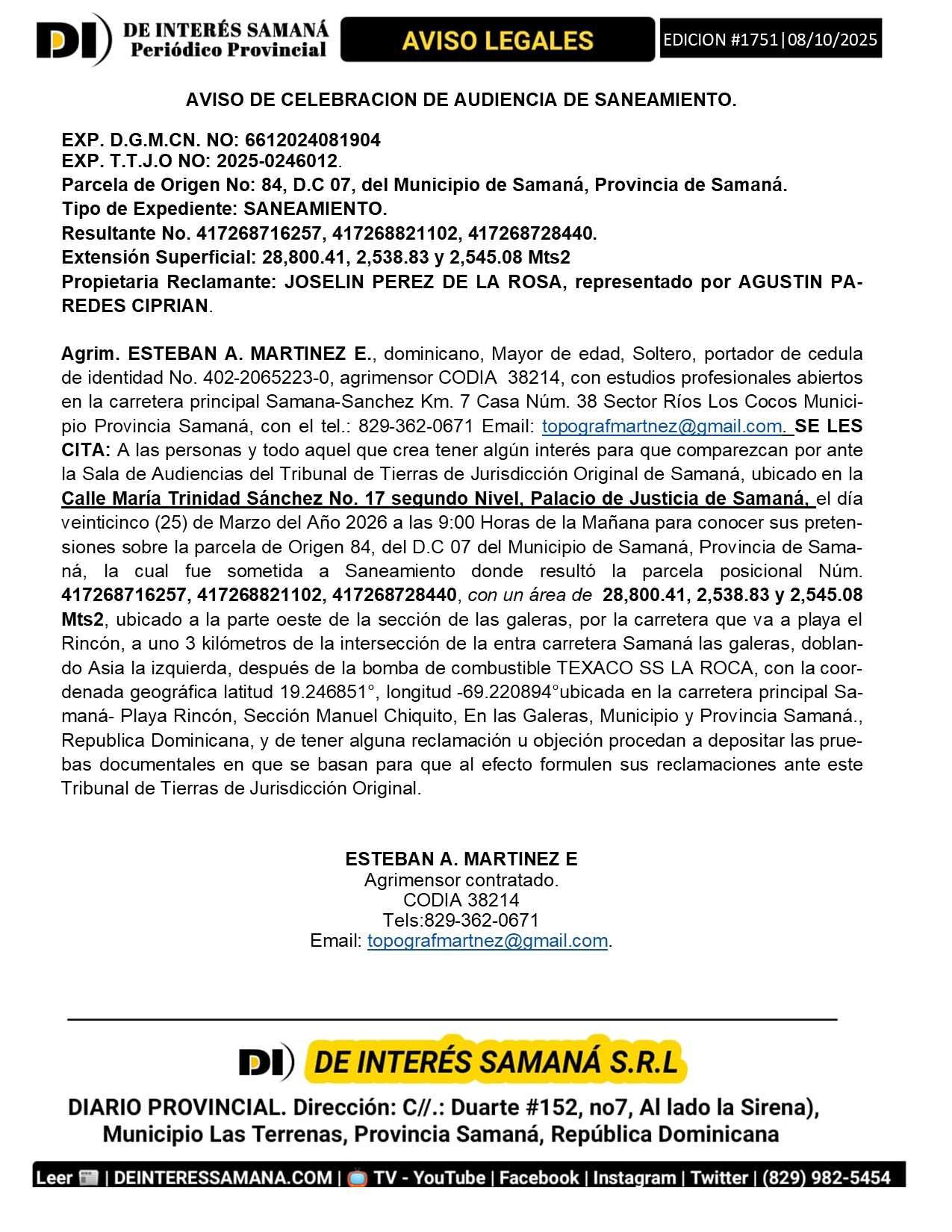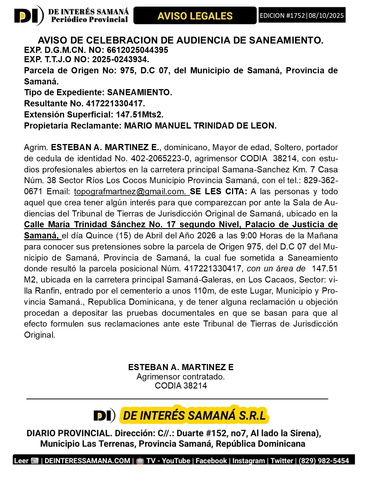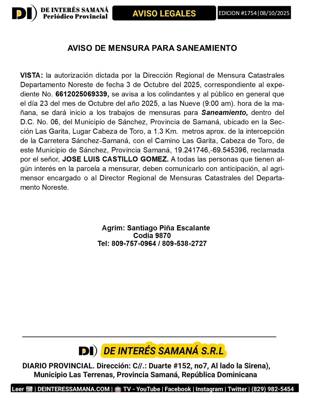 Navegación de entradas AVISOS LEGALES| Lunes 06 Octubre 2025| Provincia Samana, Republica Dominicana. AVISOS LEGALES| viernes 10 Octubre 2025| Provincia Samana, Republica Dominicana.