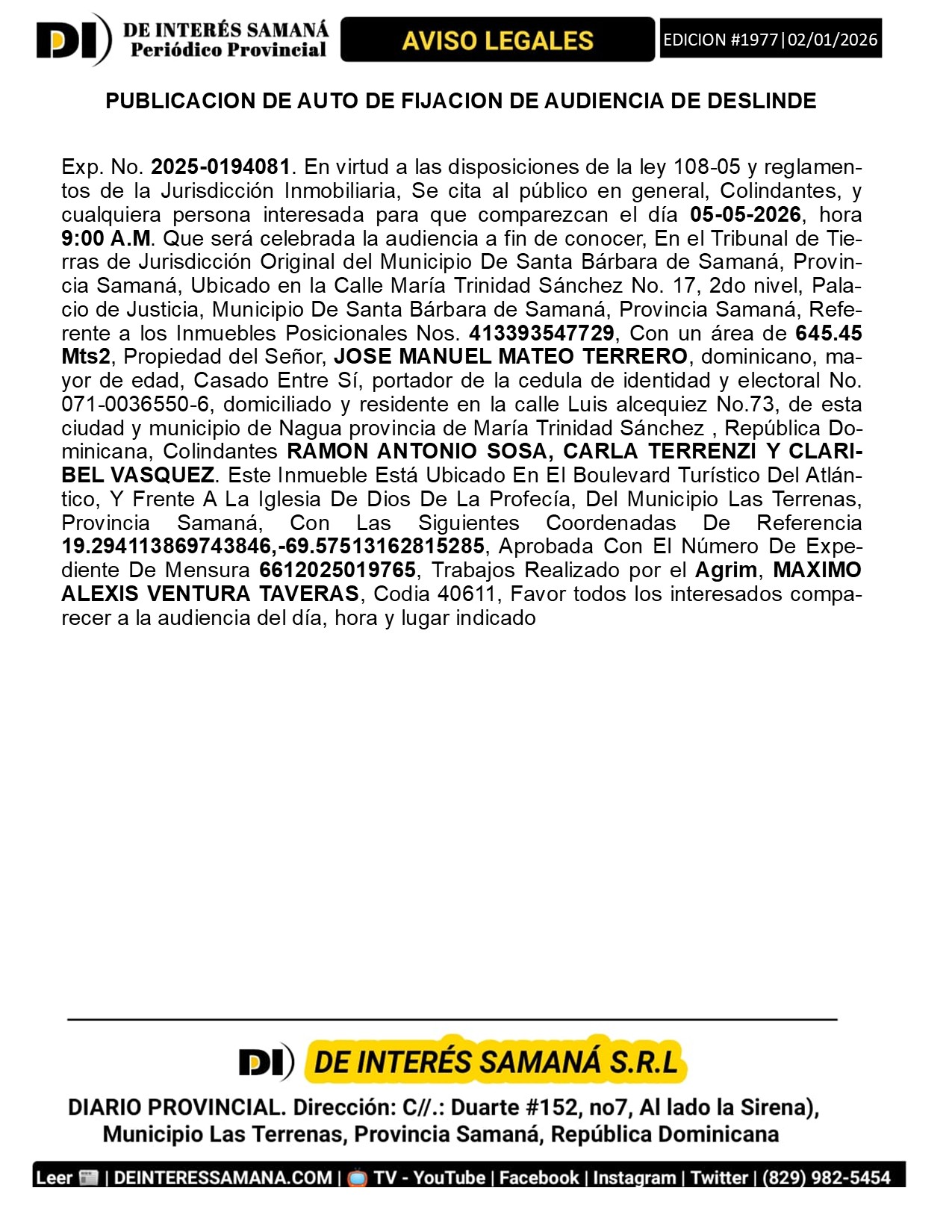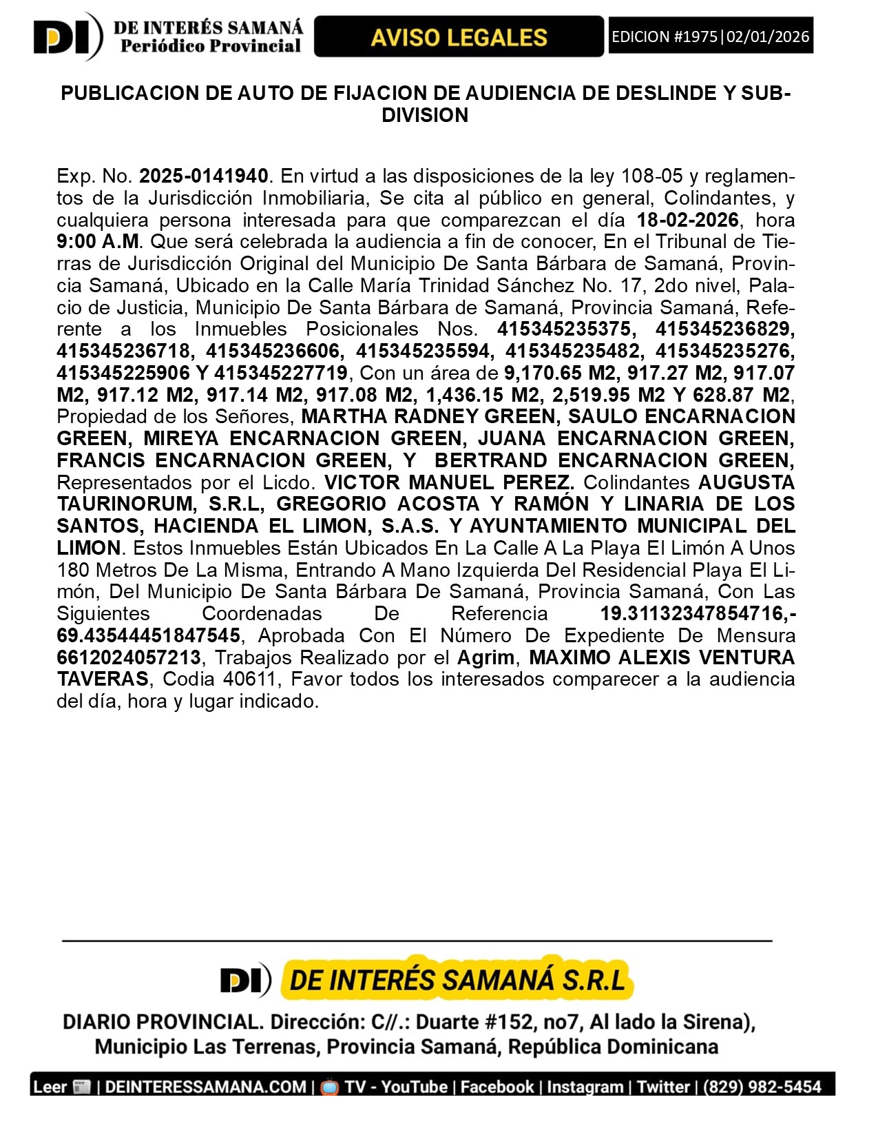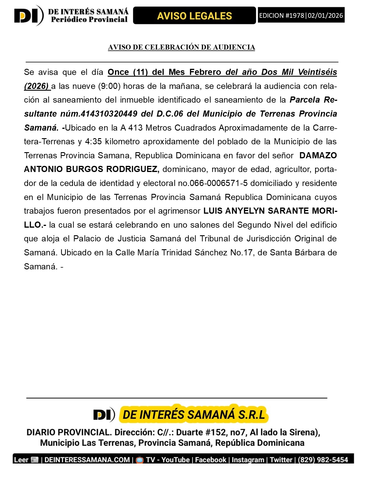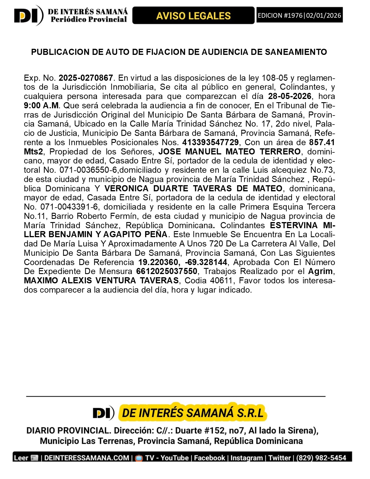 Portada » AVISOS LEGALES| Viernes 02 Enero 2026| Provincia Samana, Republica Dominicana.
