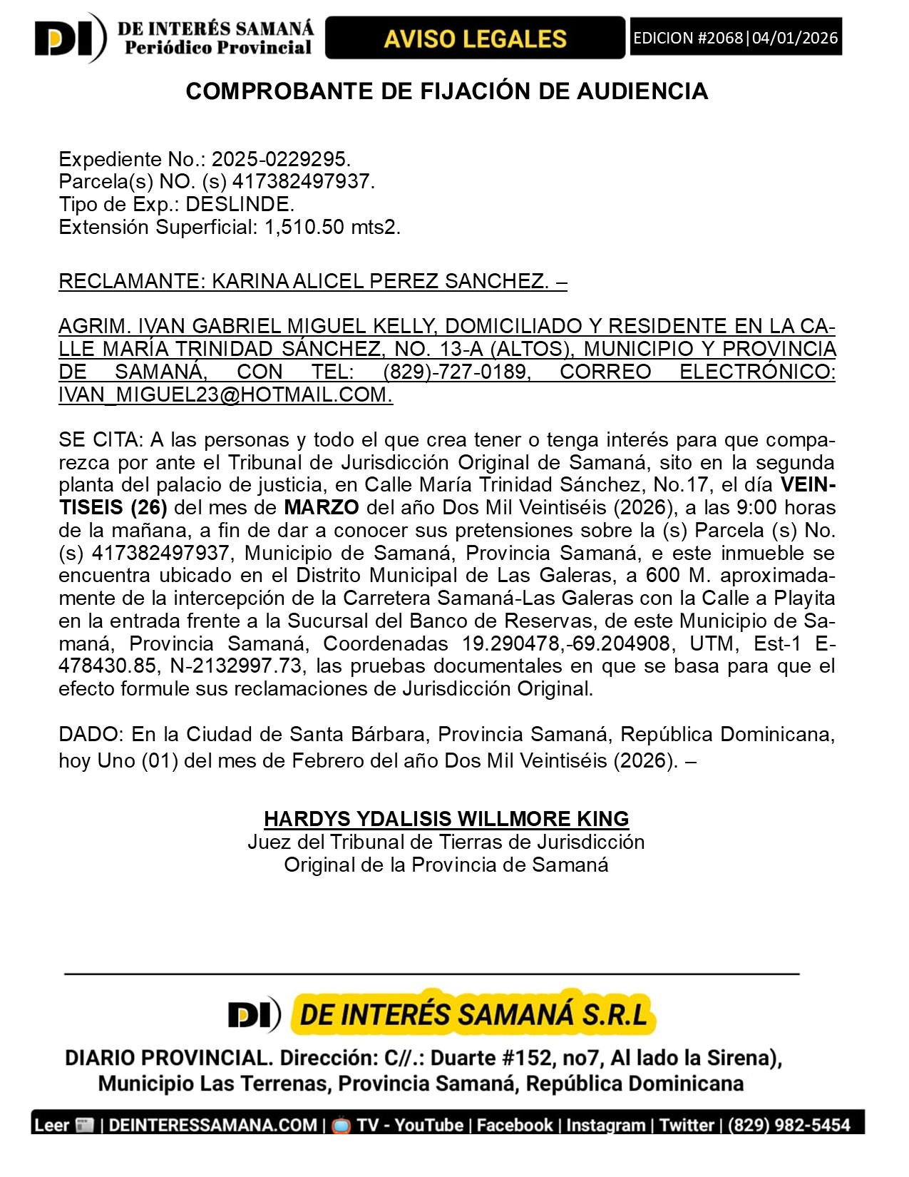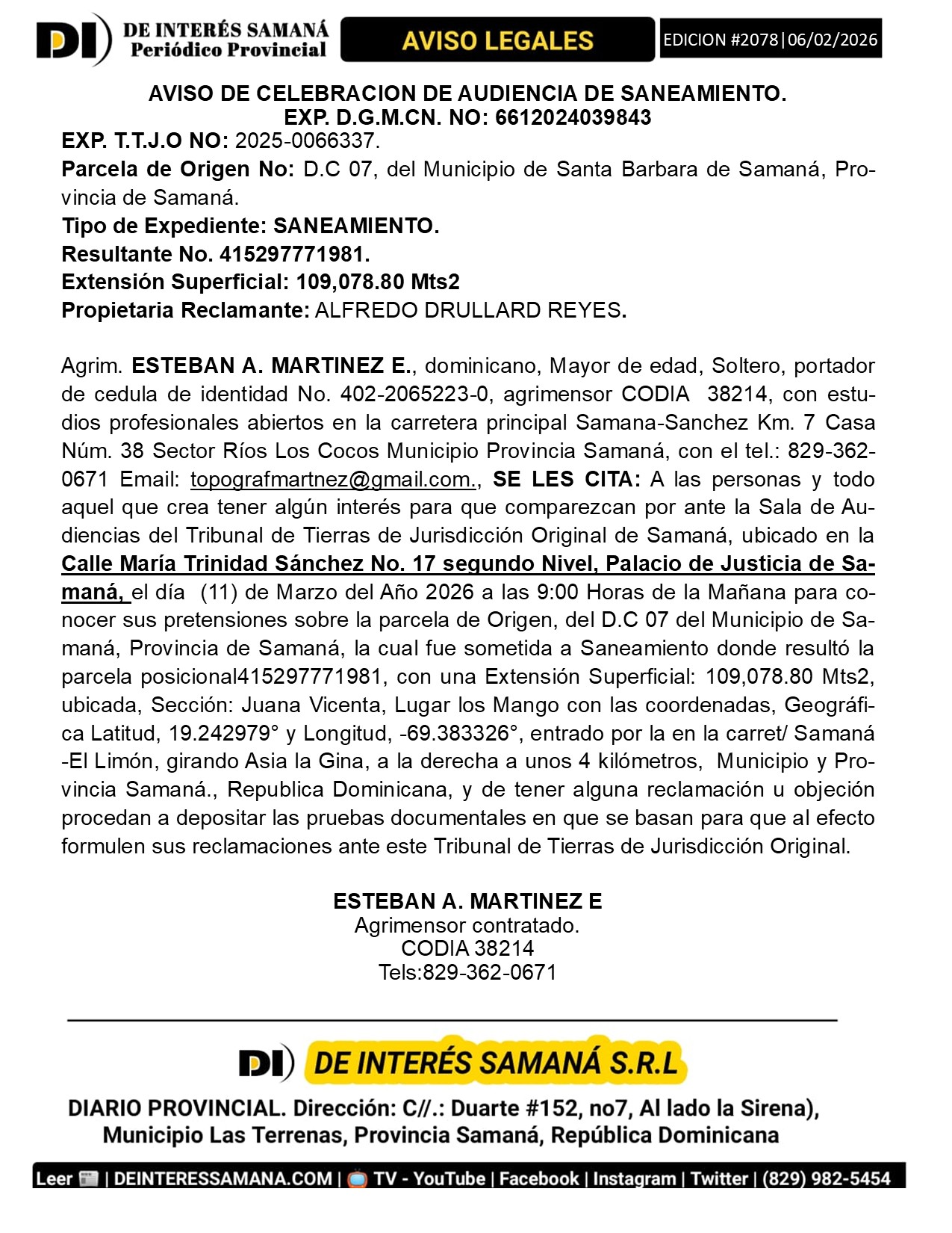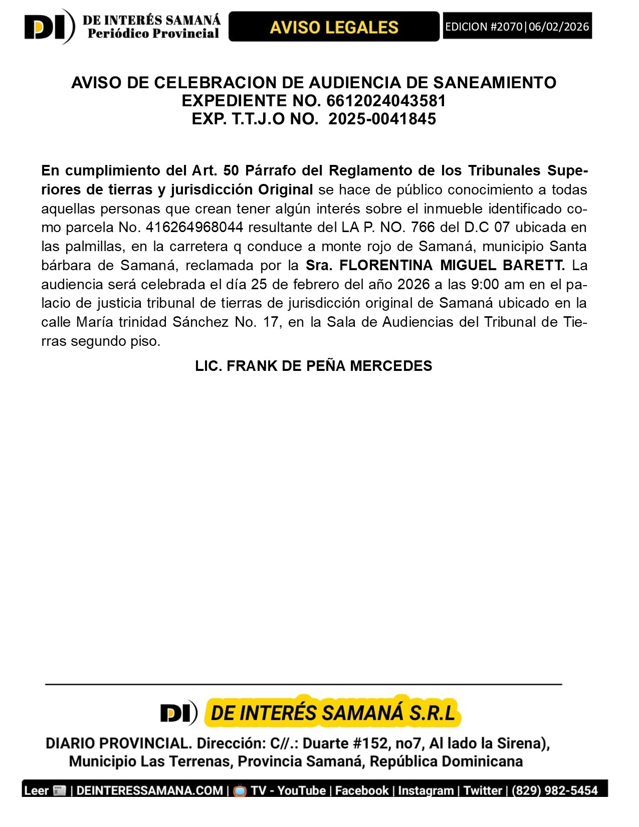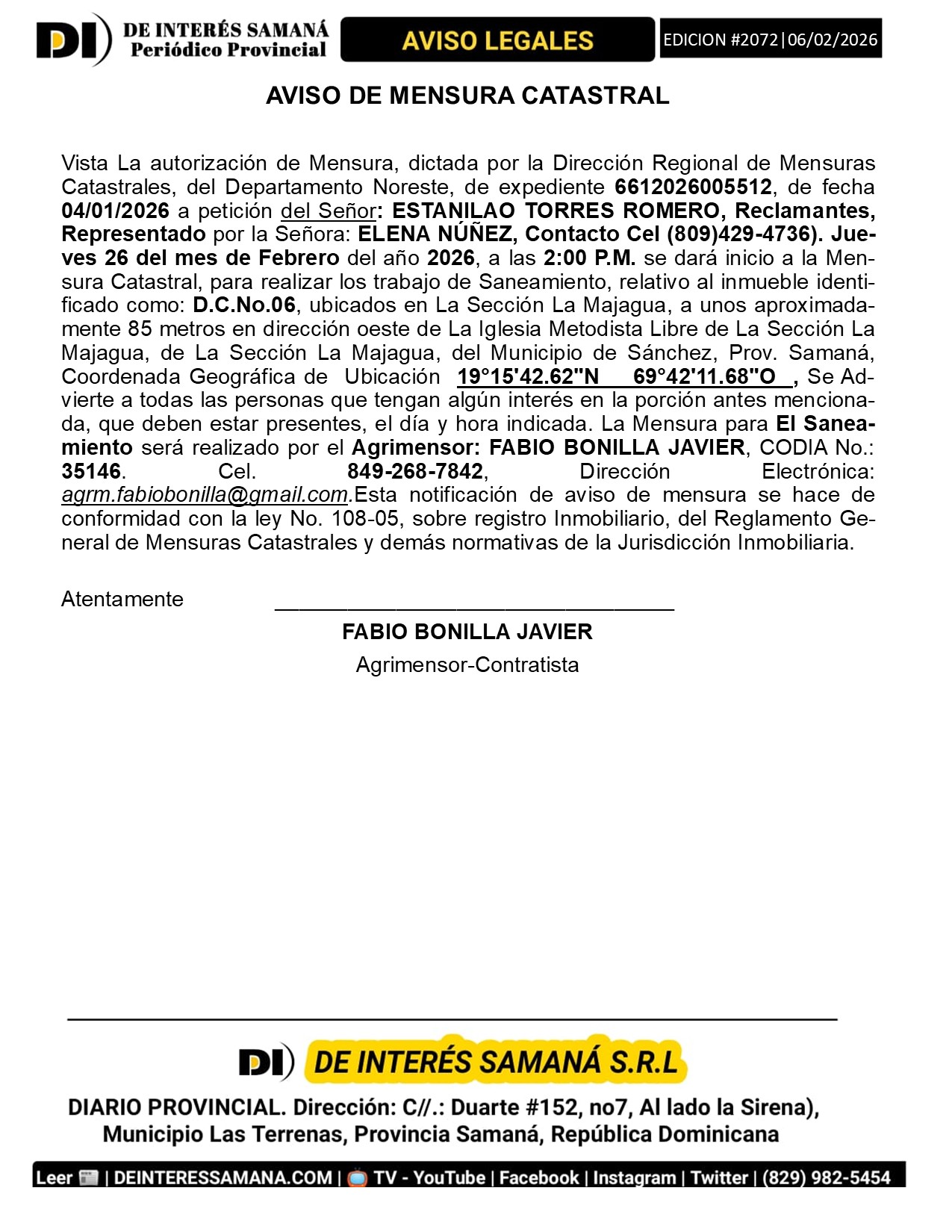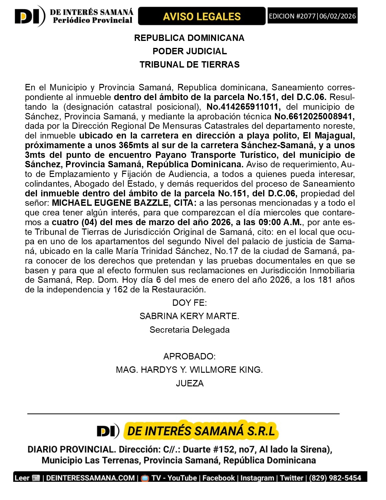 Portada » AVISOS LEGALES| Viernes 06 Febrero 2026| Provincia Samana, Republica Dominicana.