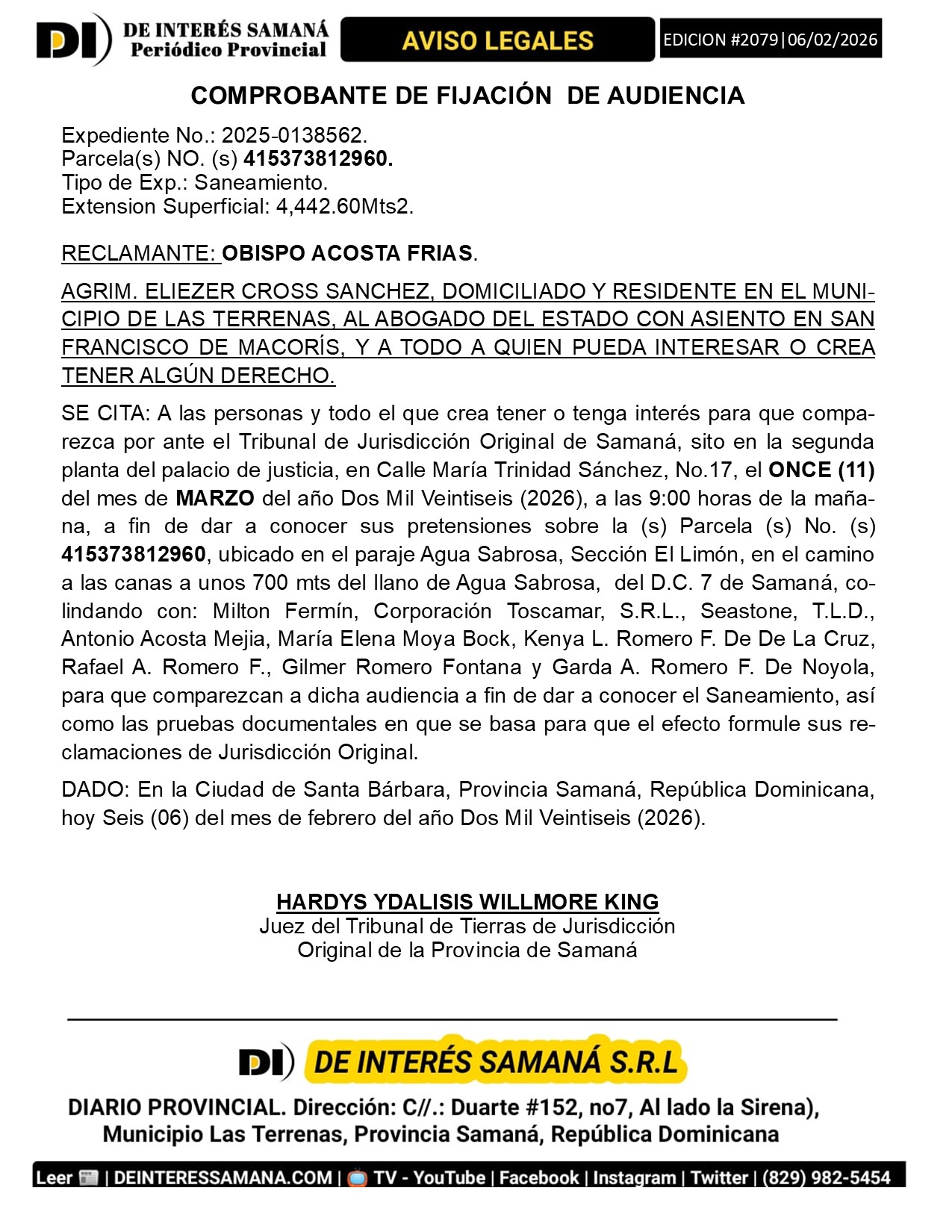 AVISOS LEGALES| Viernes 06 Febrero 2026| Provincia Samana, Republica Dominicana.
