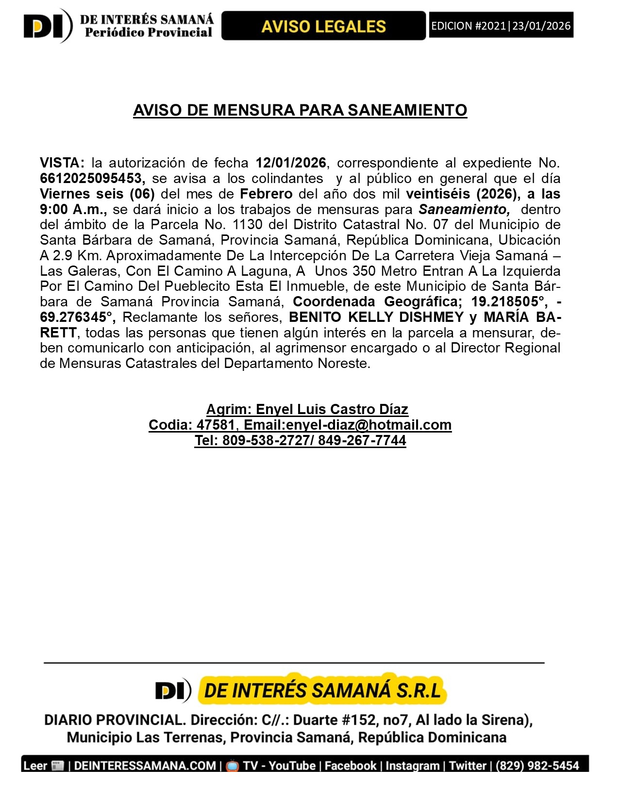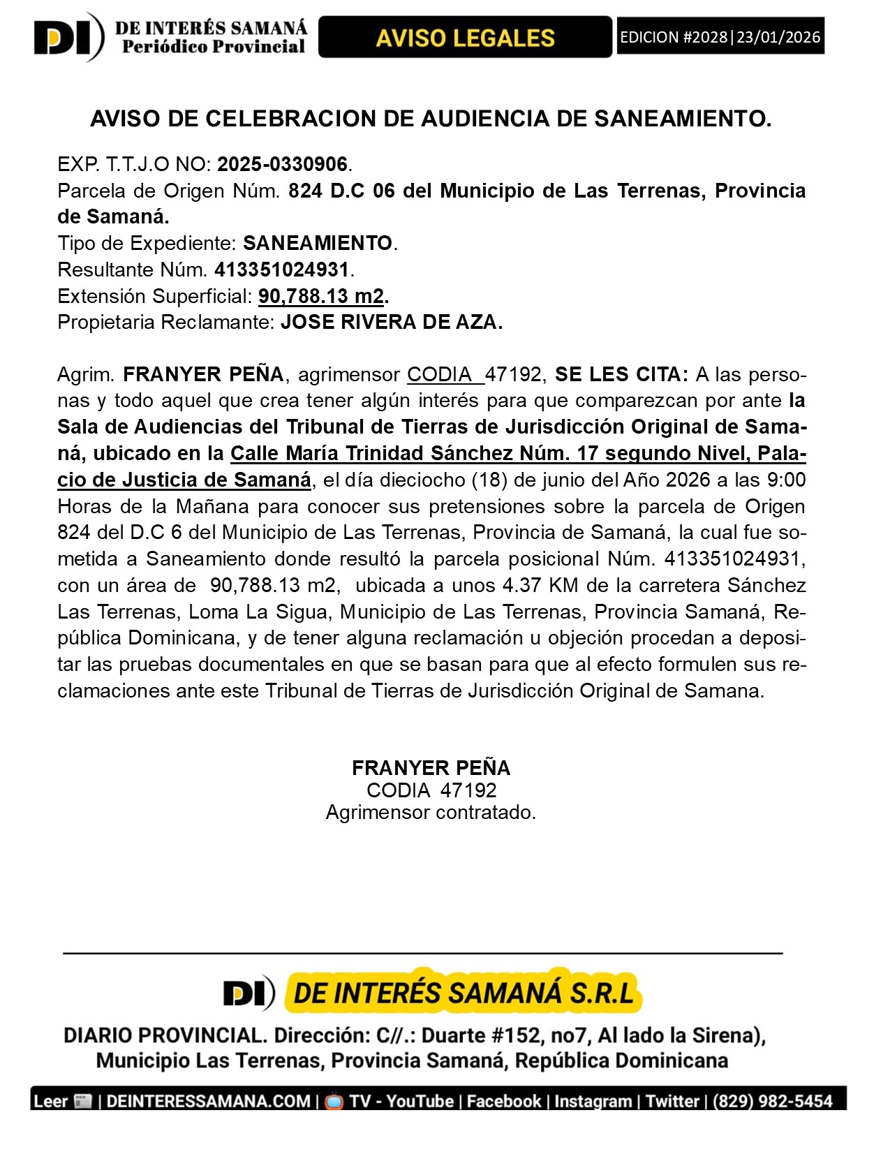 AVISOS LEGALES| Miercoles 28 Enero 2026| Provincia Samana, Republica Dominicana.