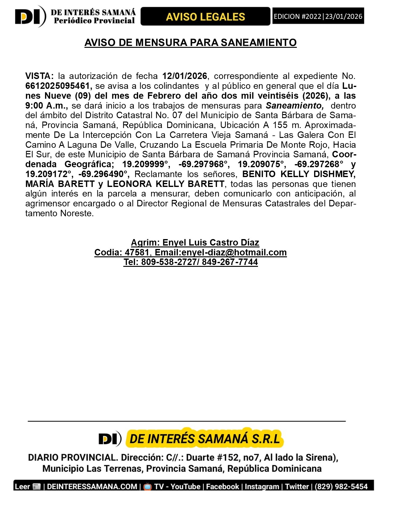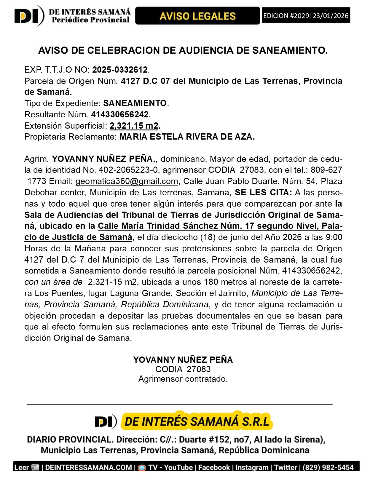 AVISOS LEGALES| Viernes 23 Enero 2026| Provincia Samana, Republica Dominicana.