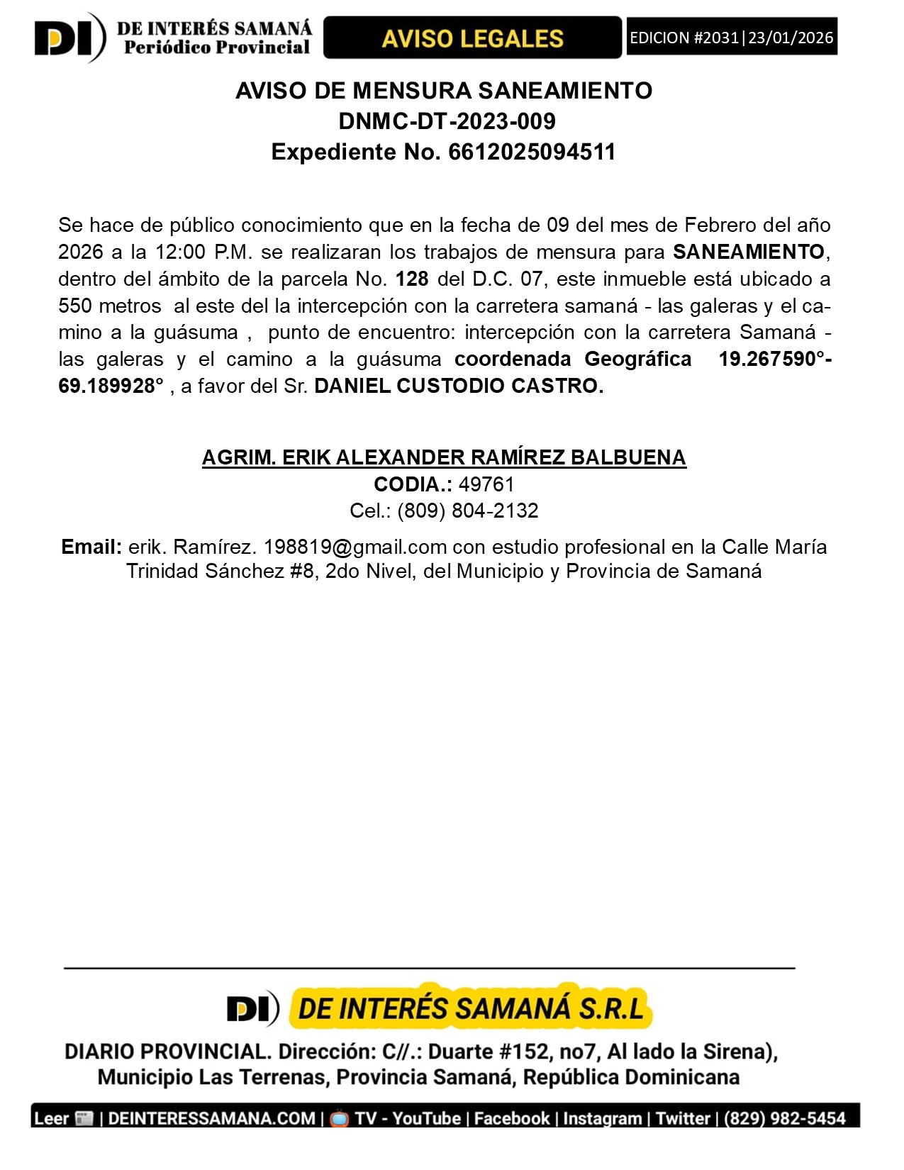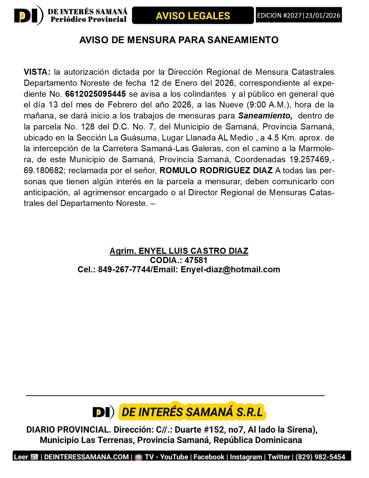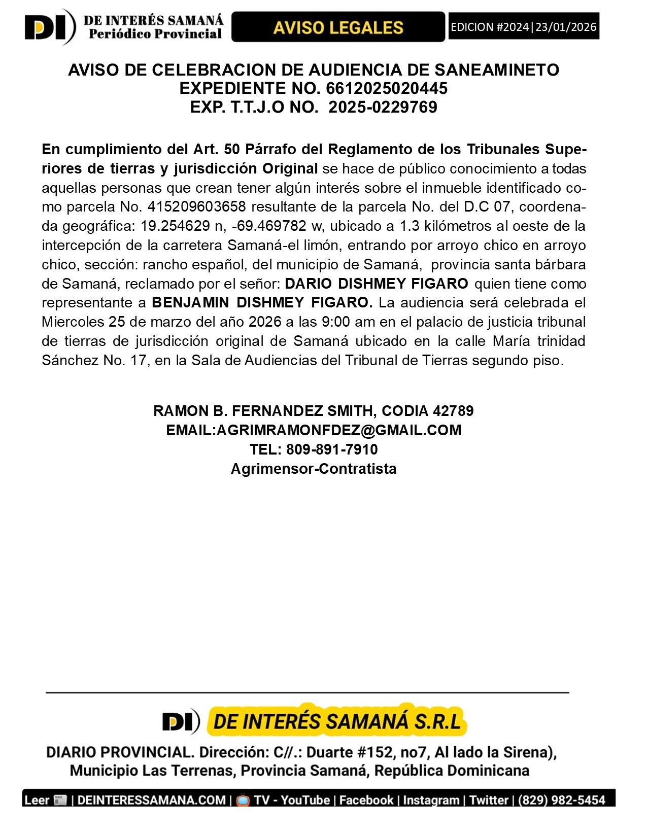 Portada » AVISOS LEGALES| Viernes 23 Enero 2026| Provincia Samana, Republica Dominicana.