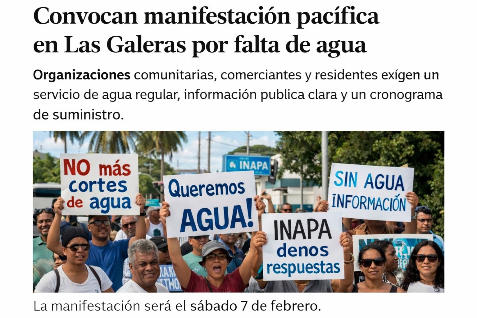 Las Galeras, Samaná.– Organizaciones comunitarias, comerciantes y residentes de Las Galeras convocaron una manifestación pacífica para exigir un servicio de agua regular, información pública clara y un cronograma de suministro.